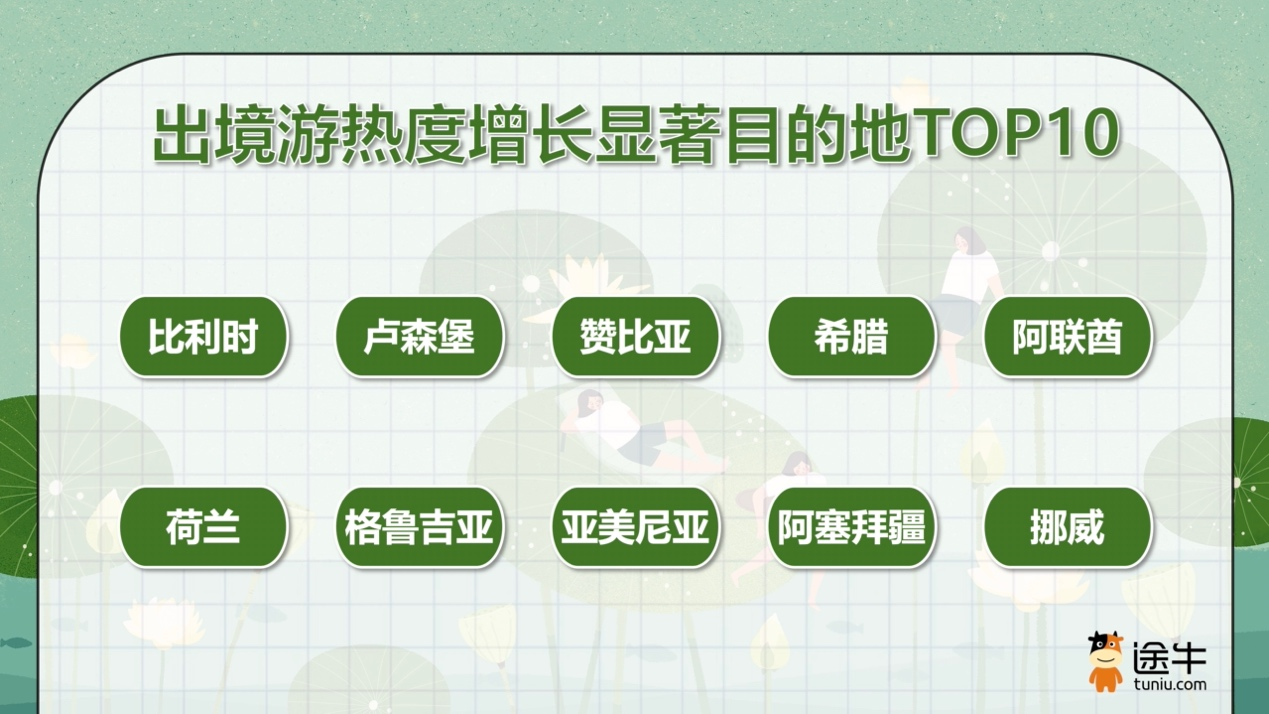 一些小众及新兴的境外目的地受到更多关注和喜爱——比利时、卢森堡、赞比亚、希腊等目的地预订出游人次同比翻番,阿联酋、荷兰、格鲁吉亚、亚美尼亚、阿塞拜疆、挪威等目的地预订热度也显著增长。