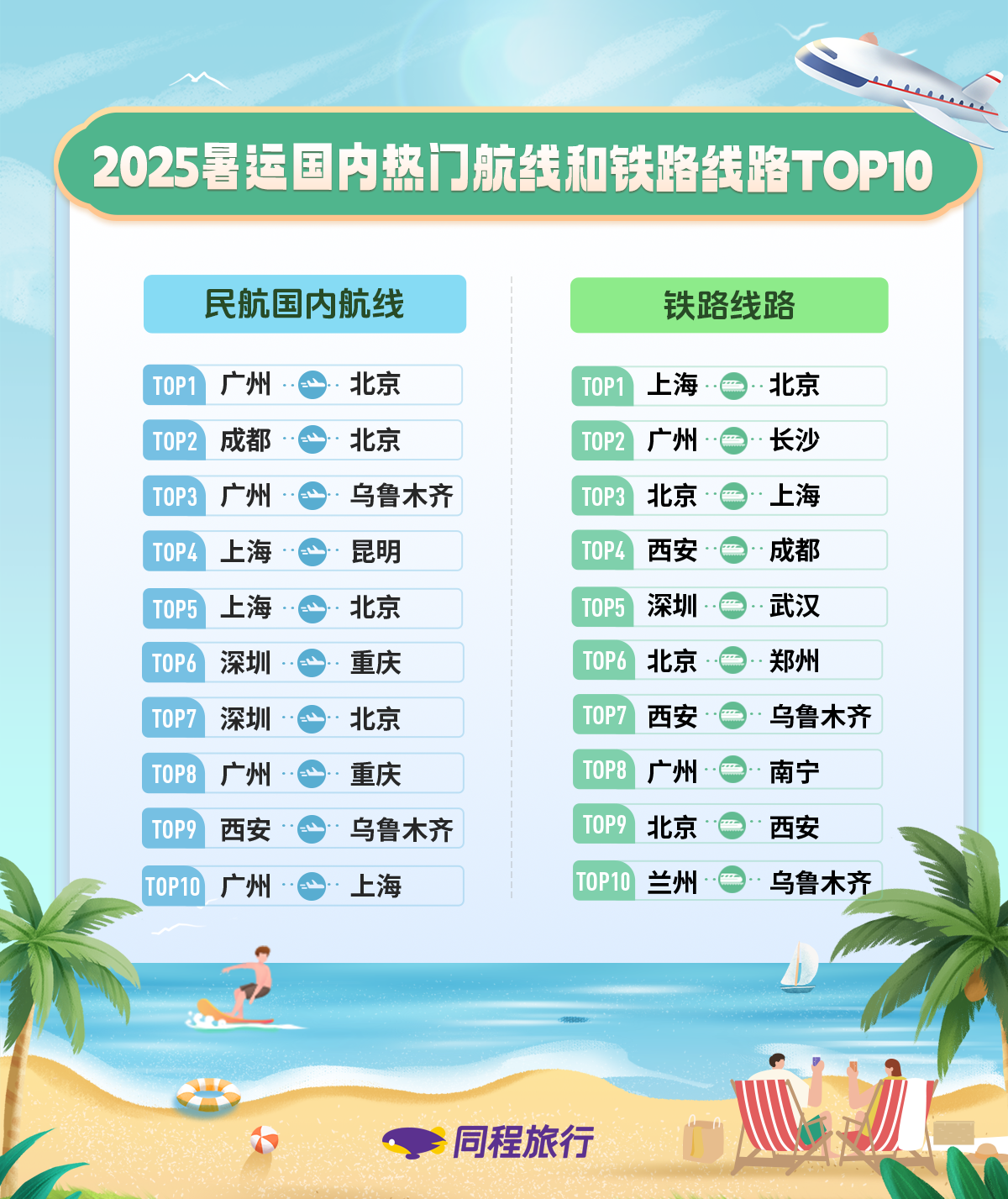 另据同程旅行暑运机票搜索数据,2025年暑运国内民航出行较热门的目的地包括北京、成都、昆明、上海、重庆、乌鲁木齐、西安、广州、三亚、深圳等,其中,广州—北京、成都—北京、广州—乌鲁木齐是热度较高的国内航线;铁路出行方面,热门线路主要是上海—北京、广州—长沙、北京—上海、西安—成都等。